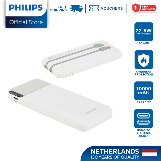 Philips White Powerbank 10000mAh 22.5W Fast Charging Built-In USB-C and Lightning Cable