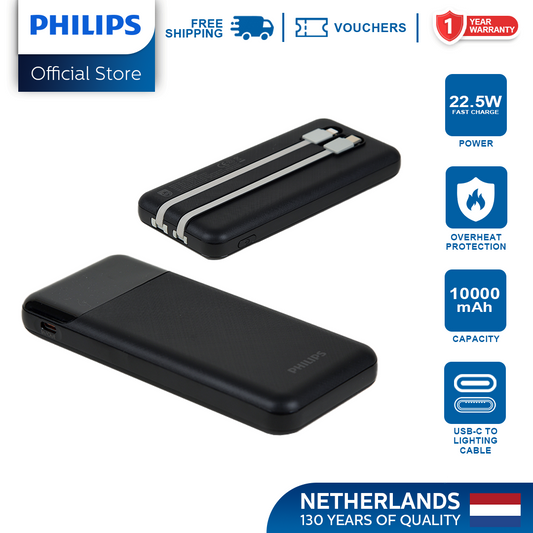 Philips Black Powerbank 10000mAh 22.5W Fast Charging Built-In USB-C and Lightning Cable