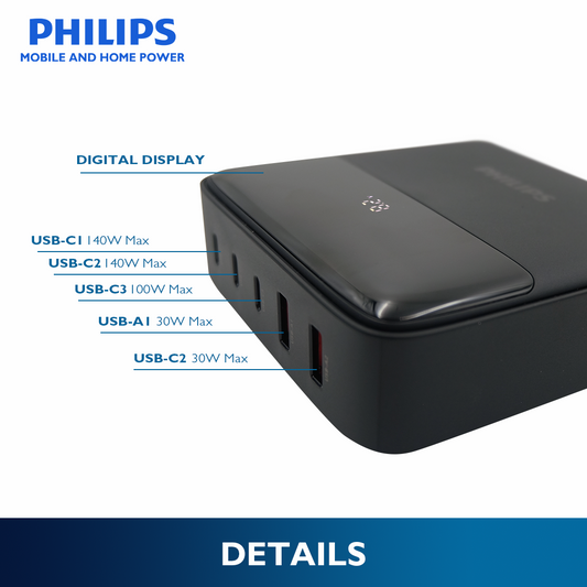 Philips Ultra Fast 240W 5-Port GaN USB Desktop Charger with Digital Display 3 USB-C and 2 USB-A port