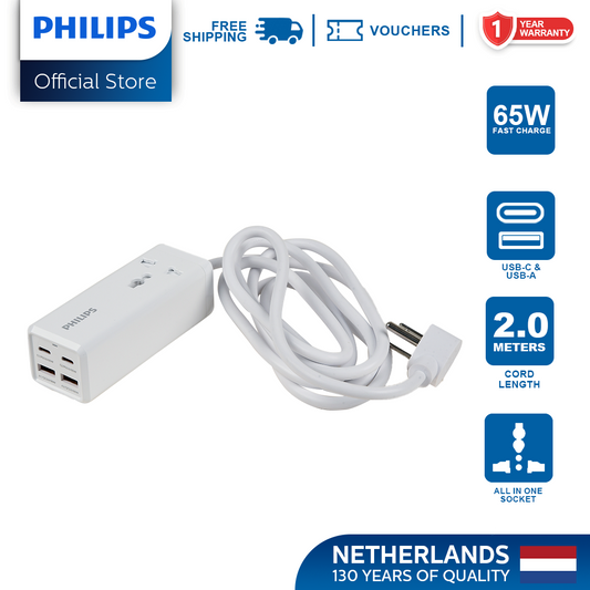 Philips PD 65W 2Meter with 2 Charger Type C USB-C and 2USB-A Universal Heavy Duty Extension Power Strips Socket